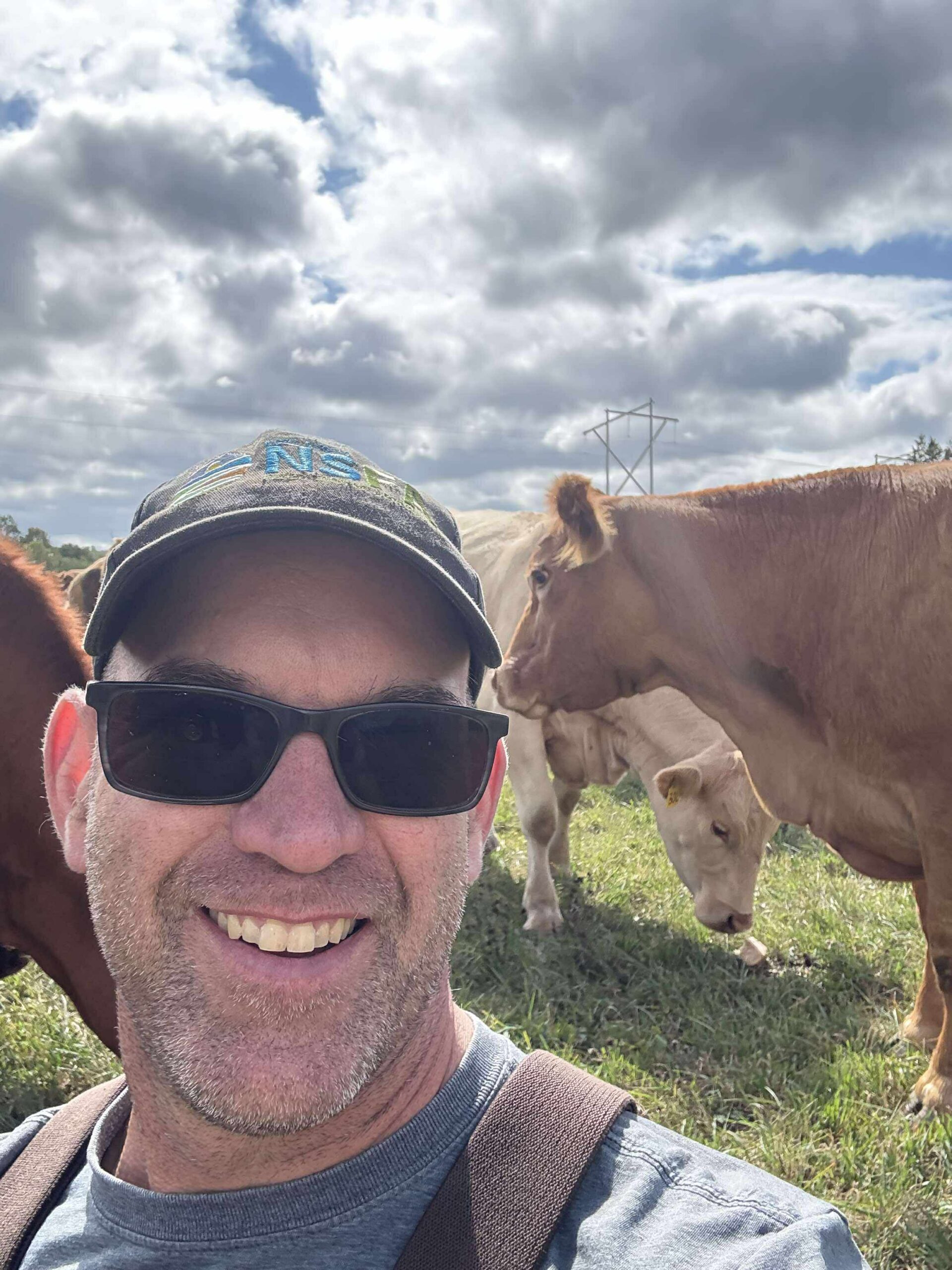Danny in the pasture with cows. Animal health is an important part of our farming ecosystem!