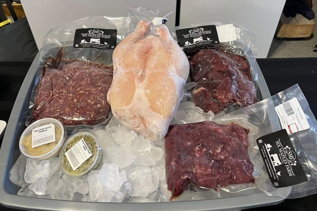 A rotating variety of Beef and Chicken from Six Maples Farm and Pork from Forever Green Farm and Garden. Including, but not limited to ground beef, stew, stir fry strip and steak. Whole chicken, boneless breasts, legs and wings. Along with ground pork, pork chops and sausages.